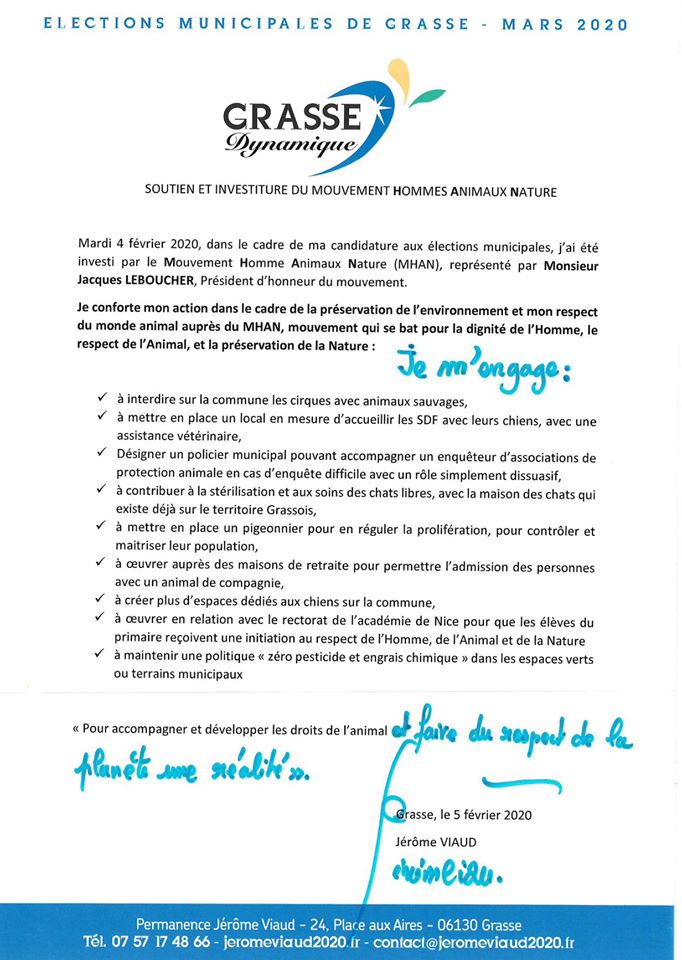 Mardi 4 février 2020, dans le cadre de ma candidature aux élections municipales, j’ai été investi par le Mouvement Homme Animaux Nature (MHAN), représenté par Monsieur Jacques LEBOUCHER, Président d’honneur du mouvement.